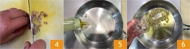 Monda y pica finamente la chalota 4. En una sartén, vierte un chorrito de aceite 5 y añade la chalota 6.