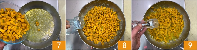 Sofríe la chalota durante 6-7 minutos a fuego suave, luego añade la calabaza 7 y cocina durante unos 15-20 minutos a fuego medio-bajo agregando agua caliente cuando sea necesario 8. Ajusta de sal 9 y pimienta.