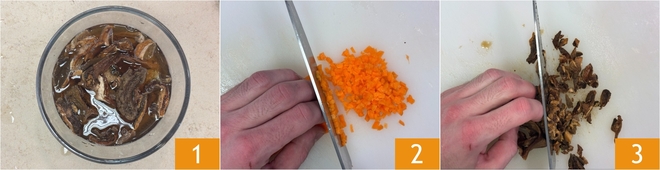 Para preparar los ñoquis de polenta con ragú de corzo, empezad por el ragú: rehidratad los porcini secos en agua tibia durante unos 20 minutos 1. Mientras tanto, limpiad y picad finamente la cebolla, el apio y la zanahoria 2. Picad también medio diente de ajo. Una vez remojados, escurrid bien los hongos y picadlos a cuchillo 3. Colad el agua de los hongos y reservadla; os servirá para la cocción del ragú.
