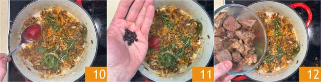 Incorporad también el concentrado de tomate 10 y las bayas de enebro 11. Por último, volved a poner la carne en la cacerola 12.