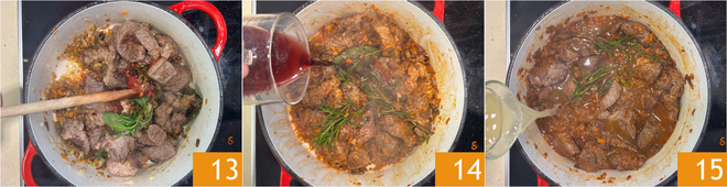 Mezclad bien todo 13, luego desglasad con el vino tinto 14. Subid el fuego y dejad evaporar todo el alcohol, después añadid el caldo caliente 15.