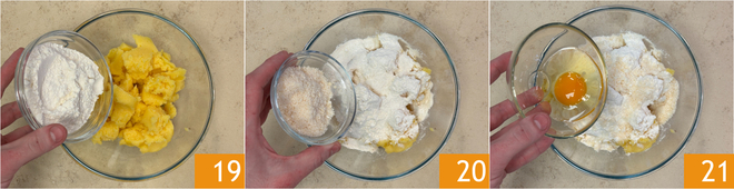 Mientras el ragú se cocina, ocupáos de los ñoquis: poned la polenta fría y bien seca en un bol, luego añadid la harina 19, el queso rallado 20 y el huevo 21.