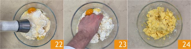 Sazonad con sal 22 y pimienta. Mezclad todo con las manos 23 hasta obtener una masa firme y homogénea 24.