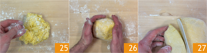 Pasad la mezcla a la superficie de trabajo, espolvoread con una pizca de harina 25 y continuad amasando hasta formar un bloque liso 26. Dividid el bloque en porciones más pequeñas 27.