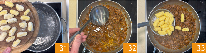Pasado el tiempo de cocción del ragú, comprobad que la carne esté muy tierna. Llevad a ebullición una olla de agua salada y coced los ñoquis 31. Mientras tanto, alargad el ragú con un cucharón del agua de cocción. Cuando los ñoquis suban a la superficie, escurridlos y echadlos directamente en el ragú 33.