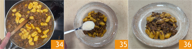 Saltead brevemente todo para integrar los ñoquis con la salsa 34. Emplatad y completad con Parmigiano Reggiano rallado al gusto 35. ¡Vuestros ñoquis de polenta con ragú de corzo están listos para servir 36!