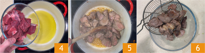 Calentad el aceite en una cacerola amplia, luego añadid la carne cortada en dados 4 y doradla a fuego medio-alto durante unos 5 minutos, hasta que esté dorada 5. Sacad la carne de la cacerola y pasadla a un bol 6.