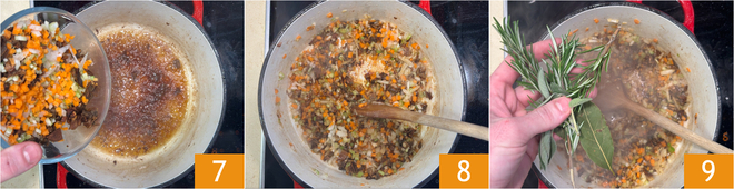 En la misma cacerola echad la picada de verduras, el ajo y los hongos secos 7 y dejad sofreír unos minutos 8. Cuando el sofrito se haya ablandado, aromatizad con salvia, romero y laurel 9.