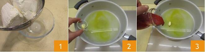 Para preparar los ñoquis de ricotta, deja escurrir la ricotta en el frigorífico durante al menos 2 horas, cubierta con film transparente, hasta que pierda el exceso de líquido 1. Dedícate al condimento: vierte la cantidad de aceite indicada en una cacerola, añade un diente de ajo entero pelado 2 y déjalo dorar. En este punto, añade la salsa de tomate 3.