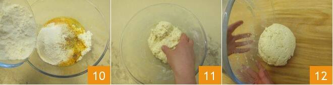 Por último, añade también la harina poco a poco 10, de forma que puedas regular la consistencia. Trabaja con la espátula brevemente para amalgamar, una vez que hayas terminado de añadir la harina amasa todo rápidamente con las manos sobre una superficie espolvoreada con un poco de sémola 11, justo el tiempo para obtener una masa homogénea, de lo contrario se desarrollará la red de gluten. Transfiere la masa a una superficie de trabajo 12. Antes de comenzar a realizar los ñoquis, pon al fuego una cacerola grande con abundante agua y sal cuando hierva.