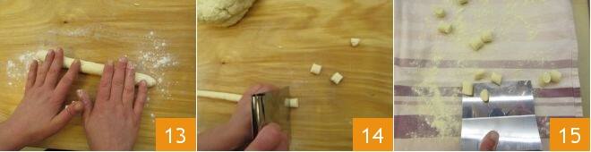 Espolvorea la superficie con la sémola remolinada y trabaja un trozo de masa a la vez, para transformarlo en un cilindro de unos 2 cm de diámetro 13. Utilizando una rasqueta ligeramente enharinada con sémola (o la hoja de un cuchillo) corta trozos de 1,5 cm 14 y a medida que estén listos transfiérelos a un paño espolvoreado con más sémola 15.