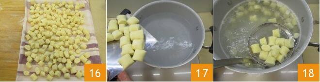 Una vez que hayas terminado 16, cocina tus ñoquis de ricotta en 3 tandas, para evitar que se amontonen en la cacerola y no se cocinen a la perfección. Entonces, vierte un poco en la cacerola con agua hirviendo (haz que hierva a fuego moderado para que el agua esté a punto de hervir durante la cocción de los ñoquis y no hierva con vehemencia) 17, hasta que suban a la superficie; tardarán unos instantes, luego escúrrelos con una espumadera 18.