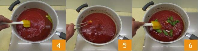 Ajusta de sal, mezcla 4, luego cubre con una tapa y cocina durante unos 30 minutos, removiendo de vez en cuando. Al término de la cocción retira el ajo 5 y añade las hojas de albahaca 6.