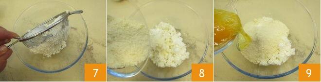 Mientras tanto, tamiza la ricotta escurrida recogiéndola en un bol 7, añade el Parmigiano Reggiano DOP rallado 8, los huevos ligeramente batidos 9, una pizca de sal.