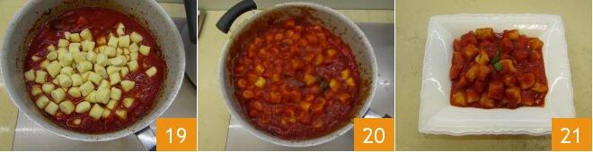 Enciende el fuego medio bajo debajo de la cacerola con la salsa, así que a medida que estén listos vierte los ñoquis 19; mezcla y continúa con la cocción para dar sabor, bastará con unos instantes 20. Una vez listos, sirve rápidamente tus ñoquis de ricotta 21.