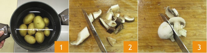Para preparar los ñoquis gratinados con setas, primero hierve las patatas para los ñoquis: pon las patatas en una olla, cúbrelas con agua fría, lleva a ebullición y cocina durante unos 30-40 minutos, dependiendo de su tamaño 1. Mientras tanto, prepara los ingredientes para el condimento: limpia las setas y corta los pleurotus en trozos irregulares 2, luego corta los champiñones en rodajas de aproximadamente 5 mm de grosor 3.
