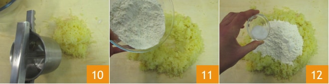 Cuando las patatas estén cocidas, aplástalas aún calientes sobre una superficie de trabajo usando un prensapatatas 10, luego añade la harina 11 y la sal 12.