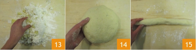 Amasa con las manos 13 hasta obtener una mezcla suave pero compacta 14. Toma una porción de masa a la vez y forma cilindros de aproximadamente 2 cm de grosor 15.