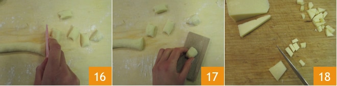 Corta los cilindros en trozos con la ayuda de una rasqueta 16 y pasa cada uno por un marcador de ñoquis o los dientes de un tenedor, presionando ligeramente con el pulgar 17. Coloca los ñoquis obtenidos sobre un paño enharinado y pon a hervir una olla con abundante agua para salar al hervir. Mientras tanto, corta el queso en cubos 18.