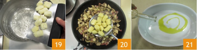 Introduce los ñoquis en el agua hirviendo 19. Tan pronto como floten, escurre los ñoquis y vierte en la sartén con el condimento 20, después saltea a fuego vivo durante unos segundos, mezclando bien todo. Ahora toma una fuente para horno y engrasa la base con un chorrito de aceite 21.