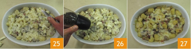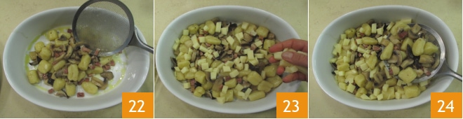 Vierte dentro la mitad de los ñoquis condimentados 22 y la mitad del queso en cubos 23, luego agrega el resto de los ñoquis 24.