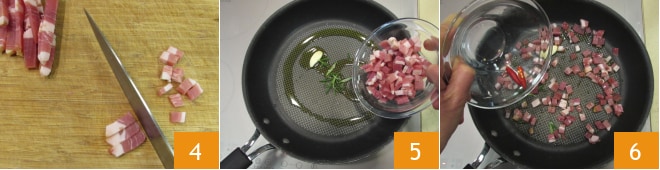Corta la loncha de jamón serrano en cubos 4. En una sartén grande, vierte un chorrito de aceite y sofríe el diente de ajo con el romero durante 1-2 minutos, luego añade el jamón 5 y el chile cortado por la mitad 6 y sube el fuego durante 3-4 minutos.
