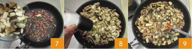 En este punto, añade las setas 7, sala 8, añade pimienta y cocina a fuego lento durante unos 15 minutos. Transcurrido este tiempo, retira el ajo y el chile 9 y reserva.