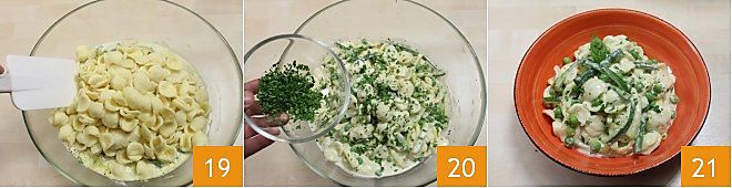 y mezcla bien todo 16. Luego cuece las orecchiette en abundante agua con sal 17, una vez que la pasta esté cocida, viértela en el bol 18 junto con la crema de yogur y verduras,