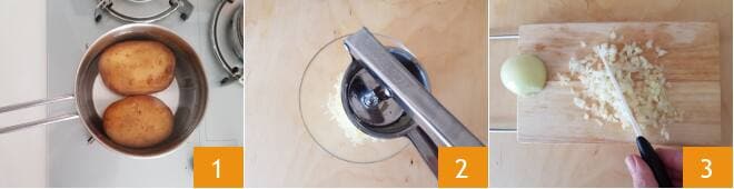 Para preparar las orecchiette con crema de patatas, brócoli y salchicha, comienza con los tubérculos. Pon las patatas en una olla con agua abundante y ponla al fuego: desde el momento en que hierve, cuenta 30 - 50 minutos o hasta que estén cocidas 1. Al final de la cocción, pélalas mientras aún están calientes y machácalas 2. Mientras tanto, prepara el condimento. Pela la cebolla y píquela finamente 3.
