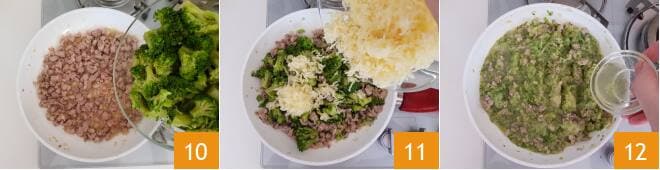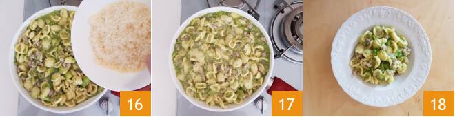 Apaga el fuego y añade el queso rallado 16, mezcla 17 y sirve inmediatamente tus orecchiette con crema de patatas, brócoli y salchicha 18.