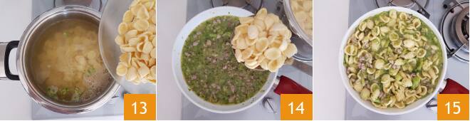 Sumerge las orecchiette en la olla de agua donde has hervido las copas, añade sal y cuécelas al dente 13, después escúrrelas directamente en el condimento 14 y mezcla 15.