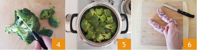 Luego limpia el brócoli separando las copas con un cuchillo pequeño 4, enjuágalas y ve a la cocina. Pon una olla con agua al fuego y, en cuanto esté a punto de hervir, sumerge las copas hirviéndolas durante 5-6 minutos 5. Al finalizar la cocción, escurre las copas pero no tires el agua, servirá para cocer las orecchiette. Pela las salchichas 6