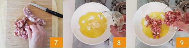y desmenúzalas 7. Pon una sartén al fuego, añade un chorrito de aceite y agrega la cebolla 8 y luego la salchicha, dorándola a fuego lento durante 5 minutos 9.