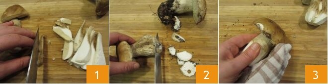 Para realizar el orzotto con setas y manzanas, prepara el caldo vegetal que te servirá caliente para ser usado en la cocción del orzotto. Luego pasa a la limpieza de las setas: elimina la base del tallo 1 limpia con un paño la superficie para eliminar los residuos de tierra 2, luego córtalas en láminas en el sentido de la longitud 3. Mantenlas aparte y continúa con la receta.