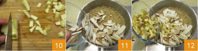 luego sin pelarlas, córtalas en pequeños cubos 10. A mitad de cocción del orzotto (después de unos 10 minutos) agrega las setas porcini 11 y las manzanas en cubos 12