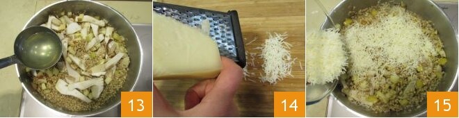 Continúa la cocción durante otros 10 minutos aproximadamente, añadiendo siempre el caldo poco a poco 13. Ralla el Pecorino semi curado 14 y cuando el orzotto esté cocido, apaga el fuego y manteca con el queso rallado 15.