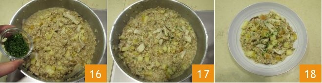 Finalmente aromatiza con el perejil fresco picado 16, mezcla para dar sabor 17 y sirve inmediatamente el orzotto con setas y manzanas bien caliente 18!
