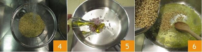 Enjuaga bajo el agua corriente la cebada 4, luego déjala escurrir en el colador. Limpia y pica la chalota, luego vierte un hilo de aceite en una cacerola, añade la chalota picada 5 y deja que se sofría a fuego moderado hasta que se vuelva transparente. En este punto, vierte la cebada 6, tuéstala un minuto,