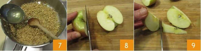 luego báñala con un cucharón de caldo 7, sala, pimienta y continúa la cocción durante unos 20 minutos como con un risotto, añadiendo el caldo poco a poco según sea necesario, removiendo de vez en cuando. Mientras el orzotto cuece, ocúpate de las manzanas: lávalas y sécalas, luego divídelas primero a la mitad 8 y luego en 4 gajos. Corta la parte central del corazón de los gajos 9,