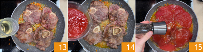 Desglasa con el vino blanco 13 y sube el fuego para que se evapore completamente el alcohol, raspando suavemente el fondo con una cuchara de madera para desglasarlo. En este punto, vierte la salsa de tomate 14, sala y pimienta 15.