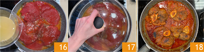 Cubre con el caldo de carne 16 y cocina a fuego bajo con la tapa durante aproximadamente 1,5-2 horas 17, revisando de vez en cuando si es necesario agregar más caldo. Al final de la cocción, la carne debe estar muy tierna y desprenderse fácilmente del hueso 18.