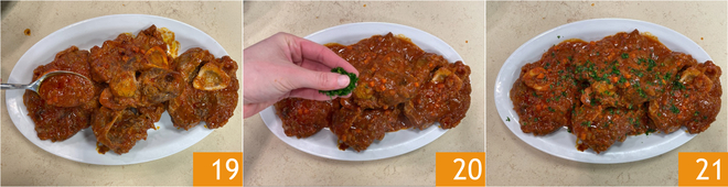 Emplata y espolvorea los ossibuchi con abundante salsa 19 y una pizca de perejil picado 20. ¡Tu ossobuco guisado está listo para ser servido 21!
