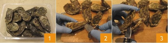 Para realizar las ostras gratinadas con setas debes abrir las ostras: Para realizar las ostras con limón y pimienta asegúrate de que las valvas de las ostras estén cerradas 1, luego abre las ostras, esta es una operación muy delicada, utiliza un cuchillo especial con la punta fina, protección en el mango para proteger los dedos y un agarre firme. Con una mano sujeta bien la ostra y con la otra agarra el cuchillo y busca la apertura (si deseas, puedes pedir en la pescadería que las ostras estén ya perforadas para facilitar la apertura), inserta la hoja y corta el músculo que se encuentra en la parte central 2, después de cortarlo será más fácil seguir la circunferencia abriendo la ostra por completo 3.