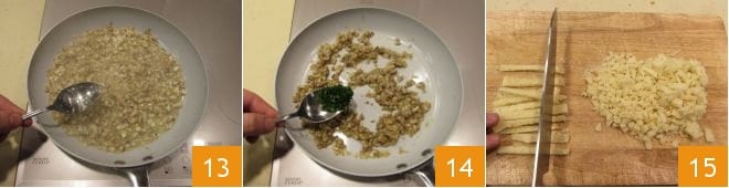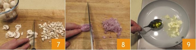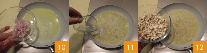 añade la chalota picada 10 y sofríela durante 10 minutos añadiendo un poco de agua tibia 11 y luego agrega también los champiñones 12,