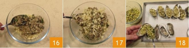 y colócala en un bol, añade los champiñones salteados en la sartén 16 y mezcla el empanado 17. Toma las valvas limpias, inserta en cada una el molusco y cubre con el empanado de setas 18.
