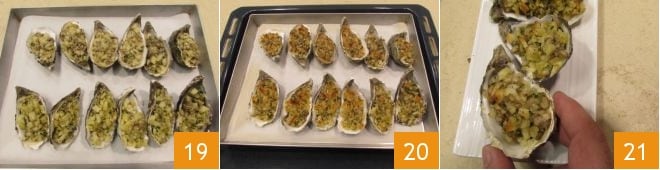 Coloca las conchas en una bandeja 19 y ponlas bajo el grill del horno durante 5 minutos hasta que el empanado esté crujiente y dorado 20. Saca las ostras gratinadas con setas del horno y déjalas enfriar antes de servirlas 21.