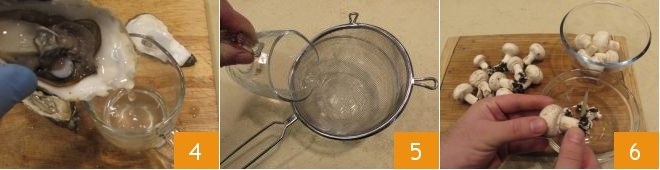 Abre las ostras y recoge su líquido en un bol 4, luego fíltralo a través de un colador 5 y separa la ostra de la concha. Cepilla la mitad de las valvas porque servirán para contener las ostras y el empanado. Ahora encárgate del empanado, limpia los champiñones 6