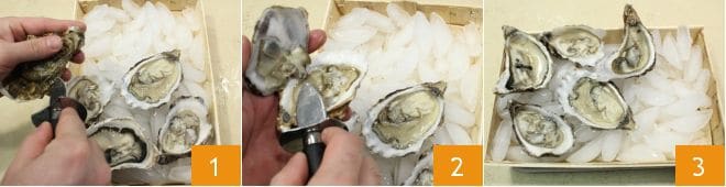 Para realizar las ostras gratinadas con anchoas y alcaparras de Pantelleria, comienza abriendo las ostras, esta es una operación muy delicada, provéete del cuchillo adecuado con punta delgada, la protección en el mango para proteger los dedos y un agarre firme. Con una mano mantén bien firme la ostra y con la otra empuña el cuchillo y busca la apertura 1 (si deseas puedes pedir en la pescadería las ostras ya perforadas para una apertura facilitada) introduce la hoja y corta el músculo que se encuentra en la parte central, abre la concha a la mitad 2, teniendo cuidado de no volcar el agua de las ostras que puedes recoger en un bol y apartar para la preparación. Elimina una mitad de la concha y reserva aquella con el molusco 3.
