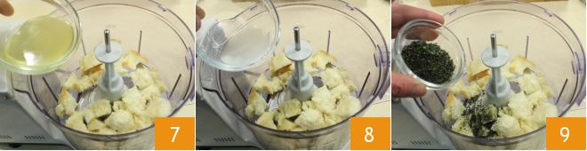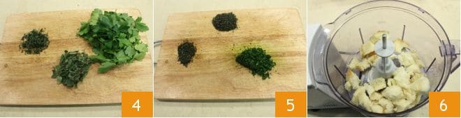 Ahora encárgate del empanado: tritura finamente el tomillo, el perejil y la mejorana (4-5) y reserva el trito. Coloca en la batidora la miga de pan 6,