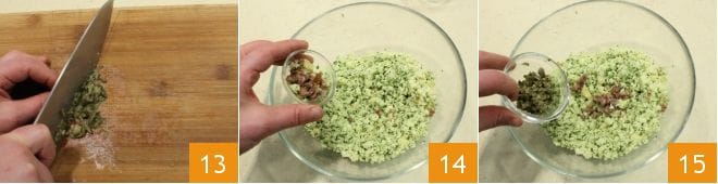 y las alcaparras de Pantelleria 13 e incorpora en el empanado tanto el trito de anchoas 14 como el trito de alcaparras 15.